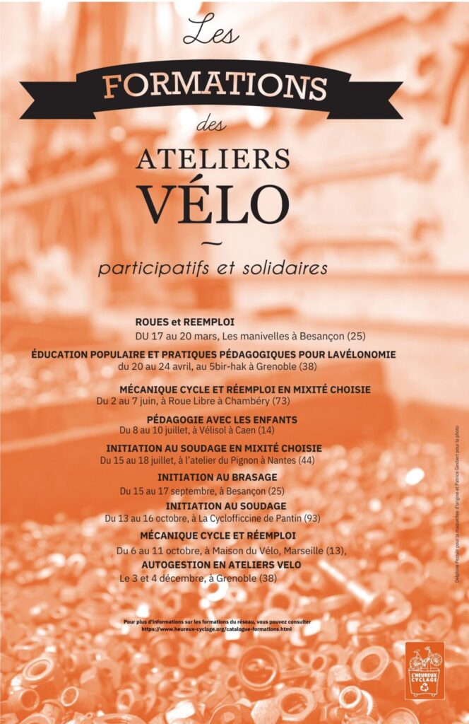 L’Heureux Cyclage (réseau des ateliers vélos participatifs et solidaires) vous propose de nombreuses formations en 2026 :