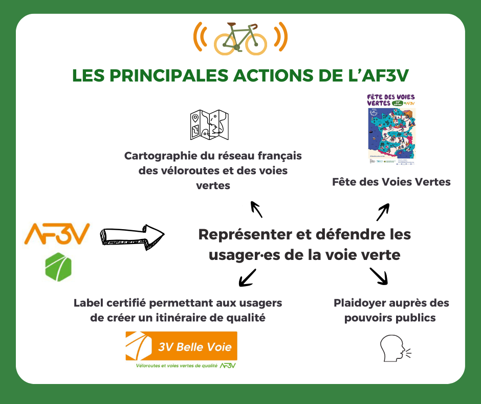 L’AF3V est l’Association Française pour le Développement des Vélo-routes et des Voies Vertes : une association nationale d’usager⸱es des véloroutes et voies vertes constituée de plus de 700 adhérent⸱es (associations, individuels, entreprises, collectivités). Leur rêve : que le territoire français soit desservi par un vaste réseau d’aménagements sécurisés et de qualité.